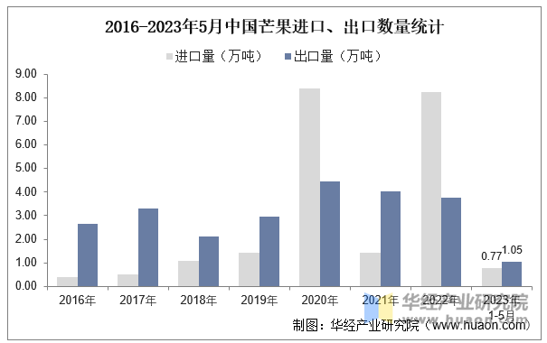 2022年我國(guó)芒果的進(jìn)口數(shù)量為8。23萬(wàn)噸,進(jìn)口額為0。57億美元;出口數(shù)量為3。77萬(wàn)噸,出口額為0。58億美元。截至5月我國(guó)2023年芒果的出口數(shù)量為1。05萬(wàn)噸。